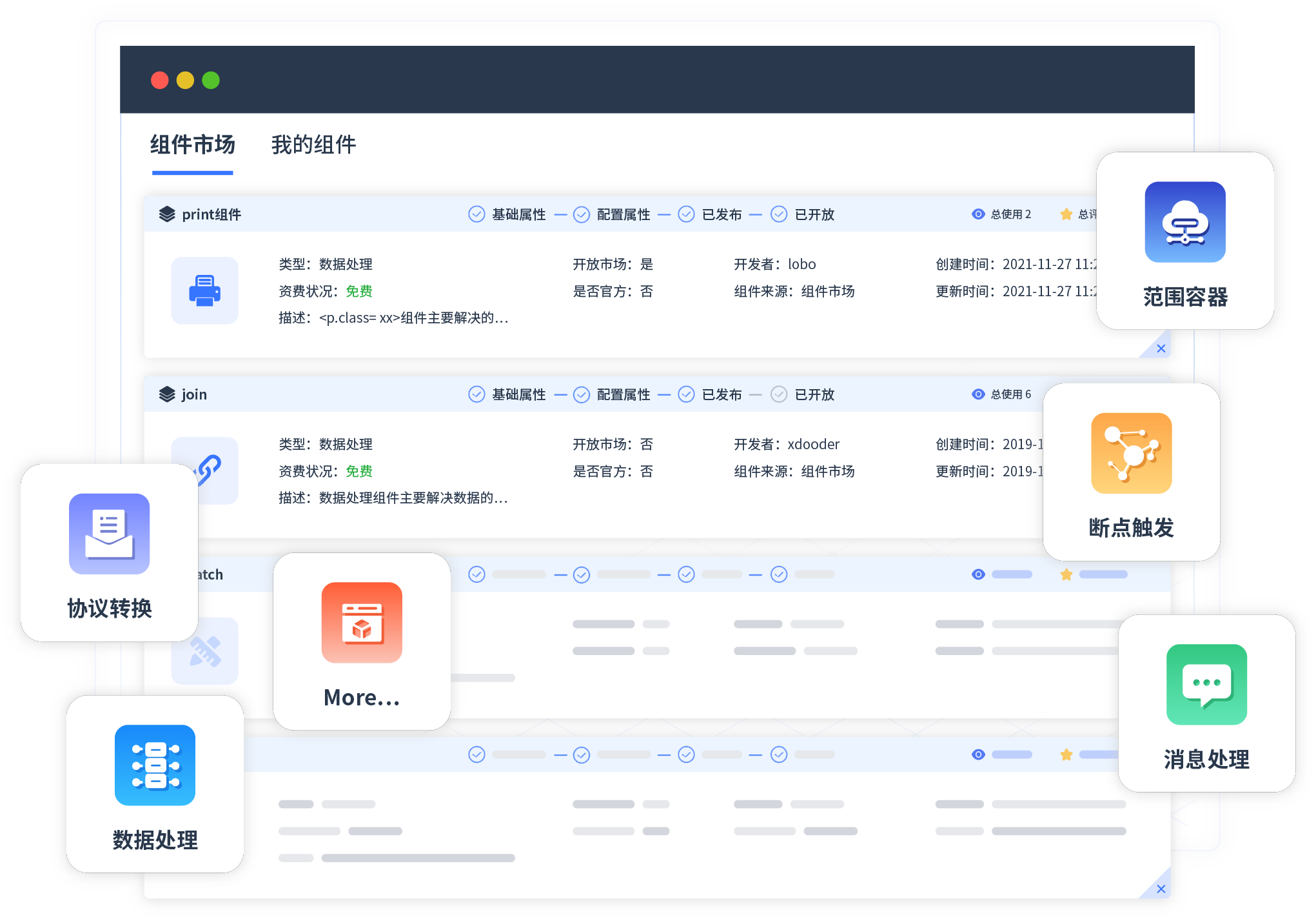 针对集成场景,意昂4提供组件市场,例如协议转换、消息处理、文件操作等。除平台提供的组件外,客户可以自定义所需组件。